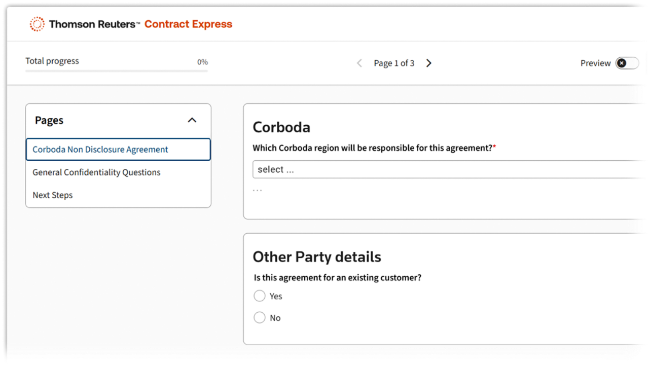 - Intuitive online questionnaire: Complete a simple, business-oriented online questionnaire to generate contracts ready for approval.