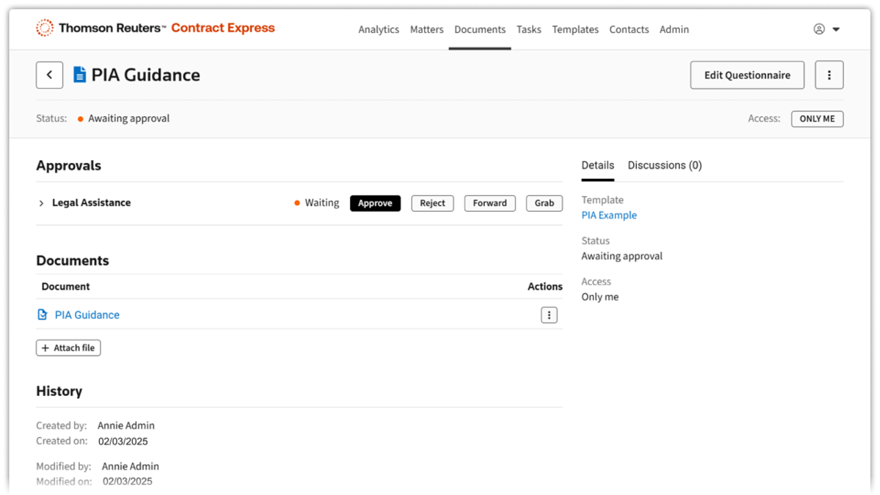 • Intelligent online form: Enable clients to complete an intelligent online form and have the Word document automatically generated and sent to a lawyer for review.