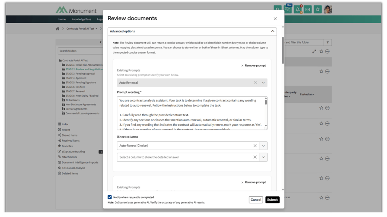 - Run new or previously created prompts: Across multiple contracts, or databases, to perform quick reviews