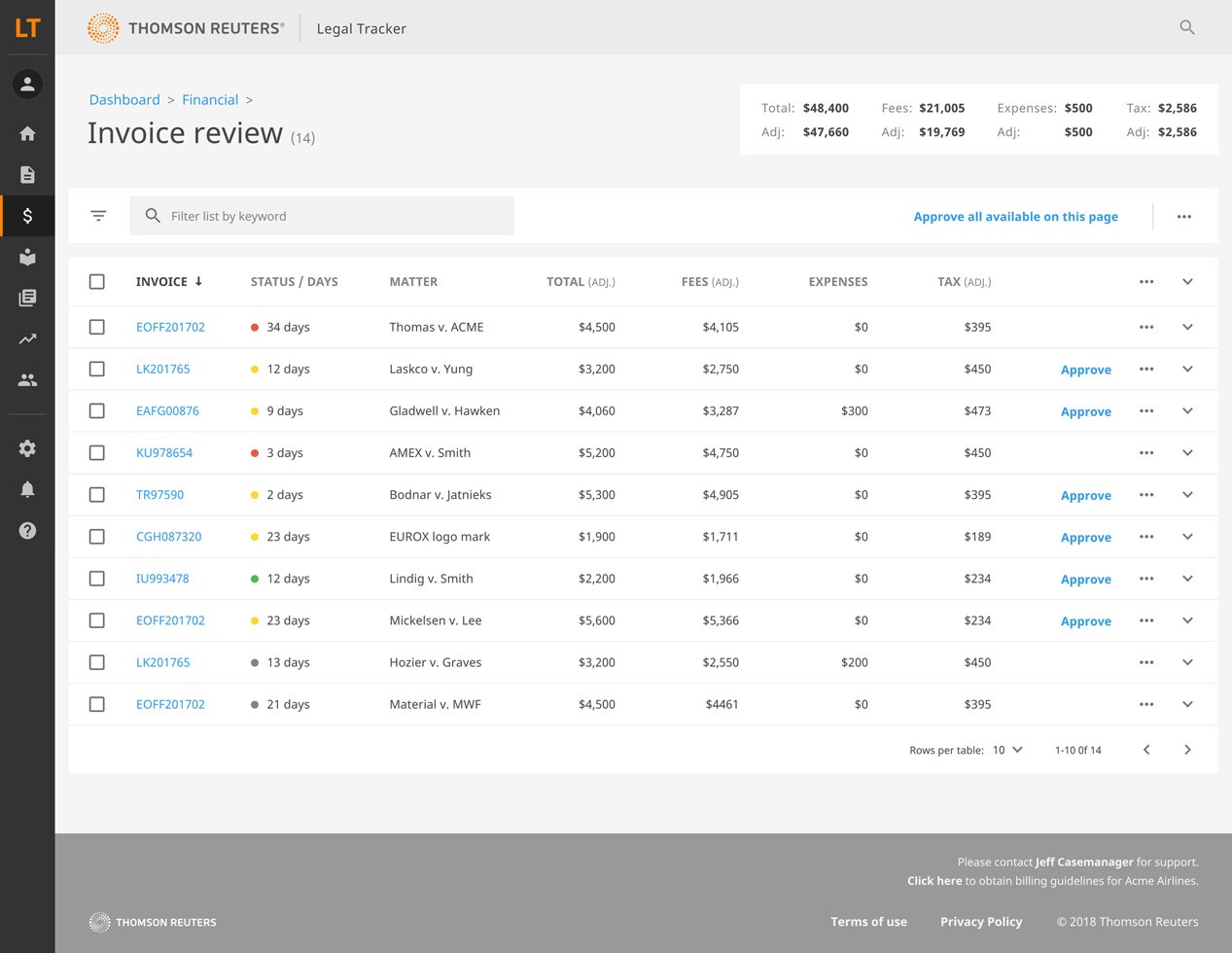 Trusted by leading organisations worldwide, Thomson Reuters’ Legal Tracker offers a comprehensive legal spend and e-billing solution designed for enterprise legal management