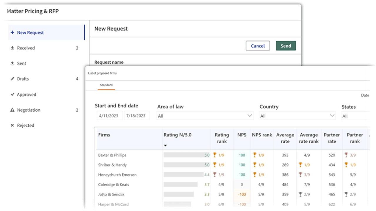 - Enhanced firm selection: Improve outside counsel performance with a targeted, competitive, and objective firm selection process during request for proposal of legal services.