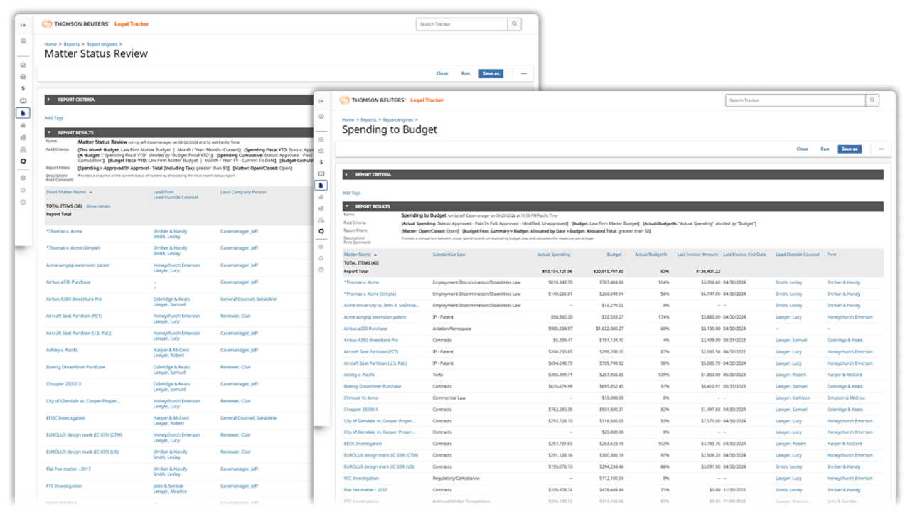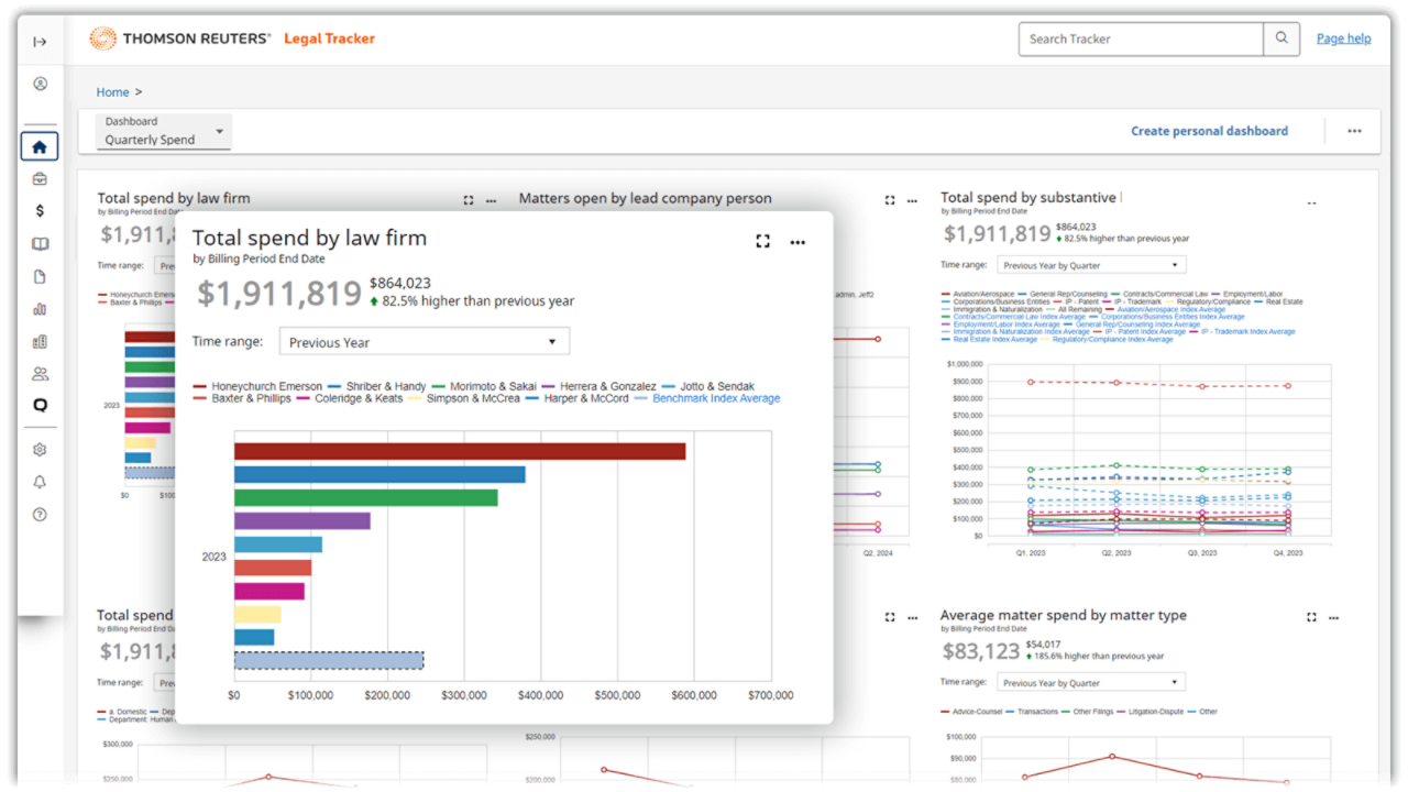 - Comprehensive insights: Access key data on matter status, spend and firms, with benchmarks to compare against other legal departments.