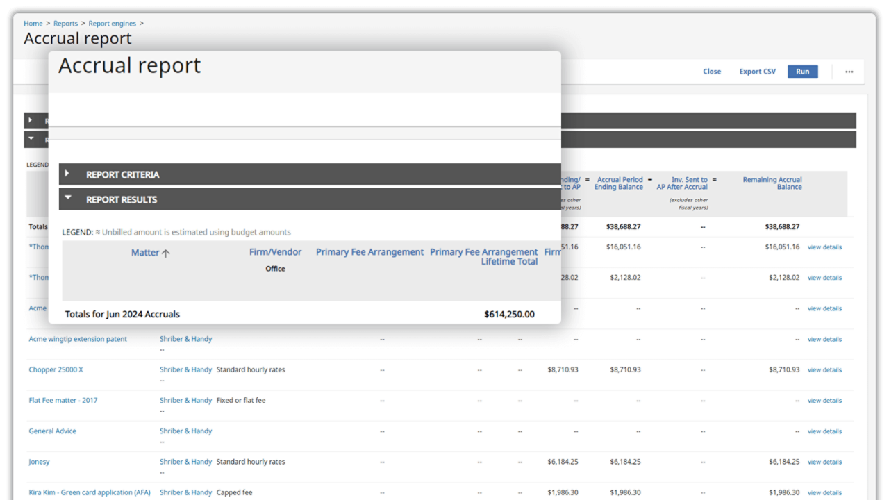 - Financial summaries: Run real-time reports for detailed insights into unbilled time, pending invoices and overall financial health of legal department operations,helping track accruals, spend and budget.